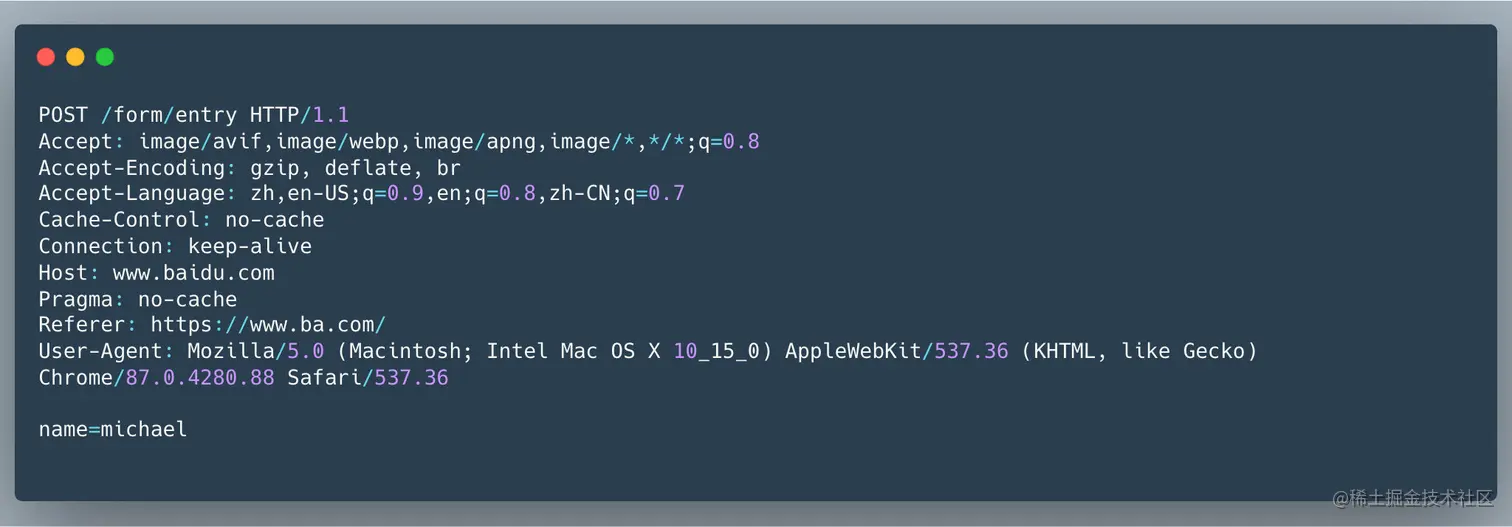 HTTP 1.1 考虑了 body 的压缩,但没有考虑 header 的压缩, 经常出现传了头部上百,上千字节,但 Body 却只有几十字节的情况,浪费了带宽,而且我们知道从 1.1 开始默认是长连接,几百上千个请求都用的这个连接,而请求的头部很多都是重复的,造成了带宽的极大浪费!想象一下面的这个请求,为了传输区区 「name=michale 」这几个字节,却要传输如此巨量的头部,浪费的带宽确实惊人。