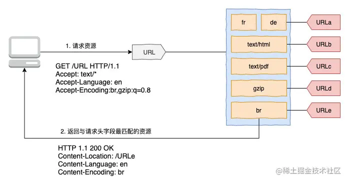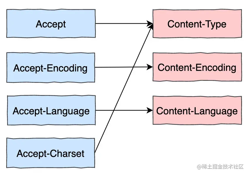 如图示:客户端使用 Accept: image/ 告诉服务器,我想请求 png,jpeg,svg 等属于 image 类型的资源,服务端返回图片的同时用 Content-Type: image/png 告诉客户端资源类型为 png。*