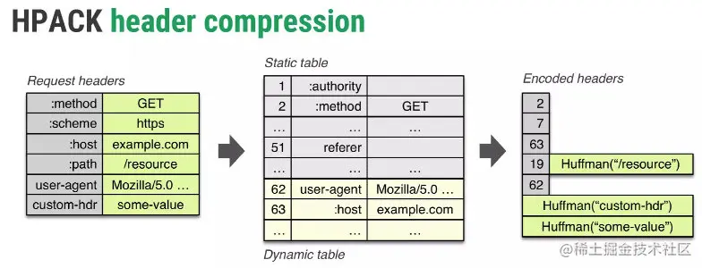 - 维护一份静态的字典(Static table),包含常见的头部名称,以及特别常见的头部名称与值的组合。这样的话如果请求响应命中了静态字典,直接发索引号即可