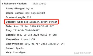 可以看到返回的 Content-Type 是 application/octet-stream,这个类型是应用程序文件的默认值,意思是未知的应用程序文件,浏览器一会不会自动执行或询问执行,会直接下载。那如果希望图片能自动展示在浏览器而非下载呢,server 指定一下 Content-Type 的具体类型如 image/png 这样的形式即可,浏览器识别到了具体类型就会自动解析展示出来。