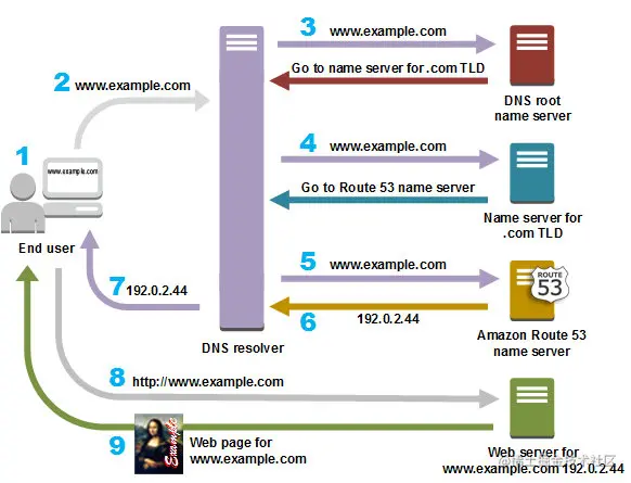 5、Amazon Route 53 名称服务器在 example.com 托管区域中查找 www.example.com 记录,获得相关值,例如,Web 服务器的 IP 地址 (192.0.2.44),并将 IP 地址返回至 DNS 解析程序。