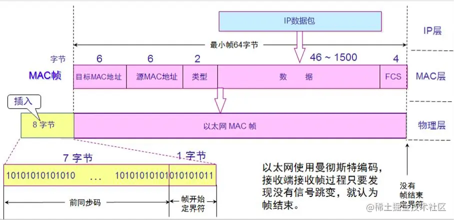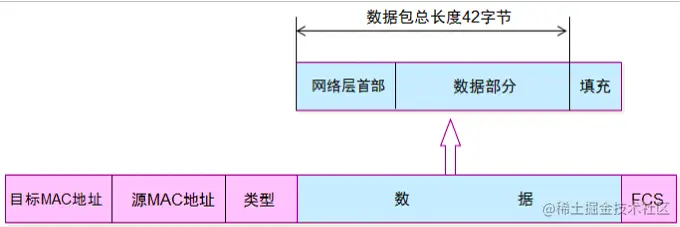 当数据部分的长度小于46字节时,数据链路层会在数据的后面加入一些字节填充,接收端会将添加的字节去掉