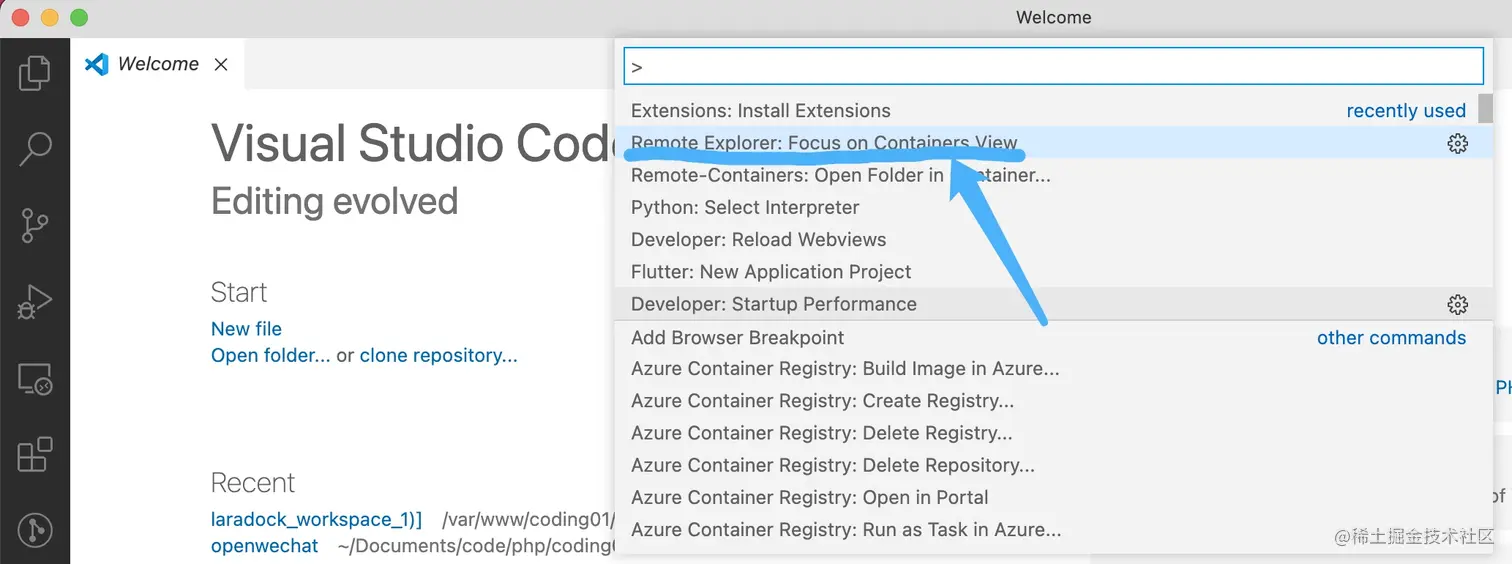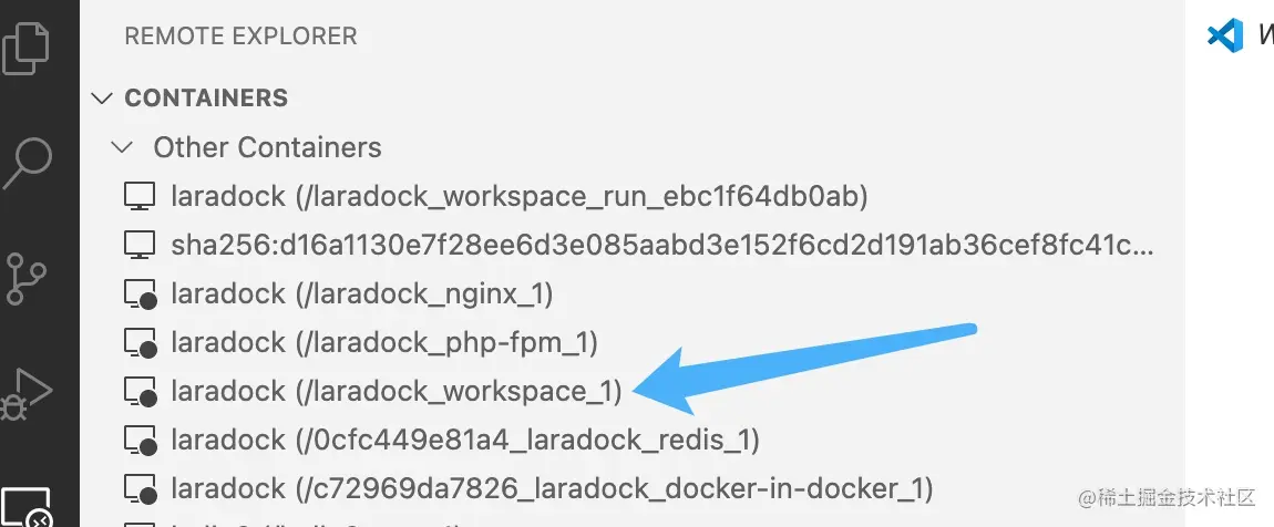 然后启动 VSCode,使用命令 F1,选择 Remote Explorer: Focus on Containers View: