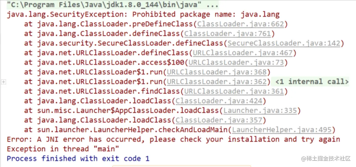 因为报名为java.lang 属于启动类加载器的加载范畴, 出于对 启动类加载器的保护,jvm禁止 自定义的类被 启动类加载器加载,防止自定义类 对启动器加载器产生破坏,
