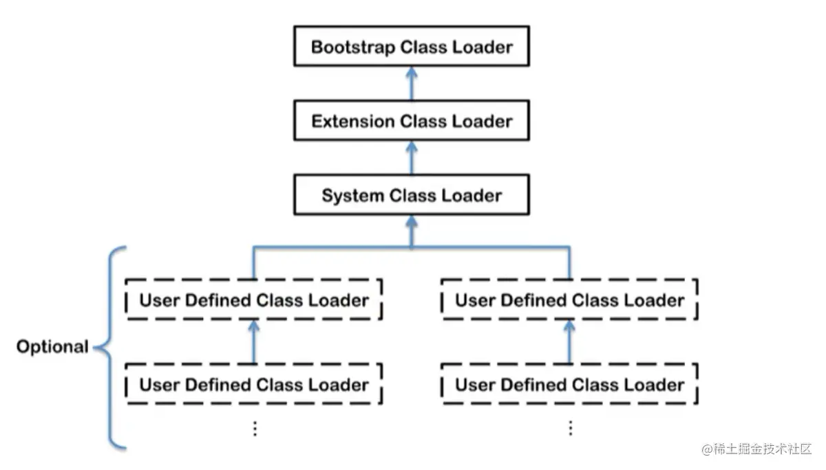 - 如果父类加载器还存在其父类加载器,则进一步向上委托,依次递归,请求最终将到达顶层的启动类加载器;