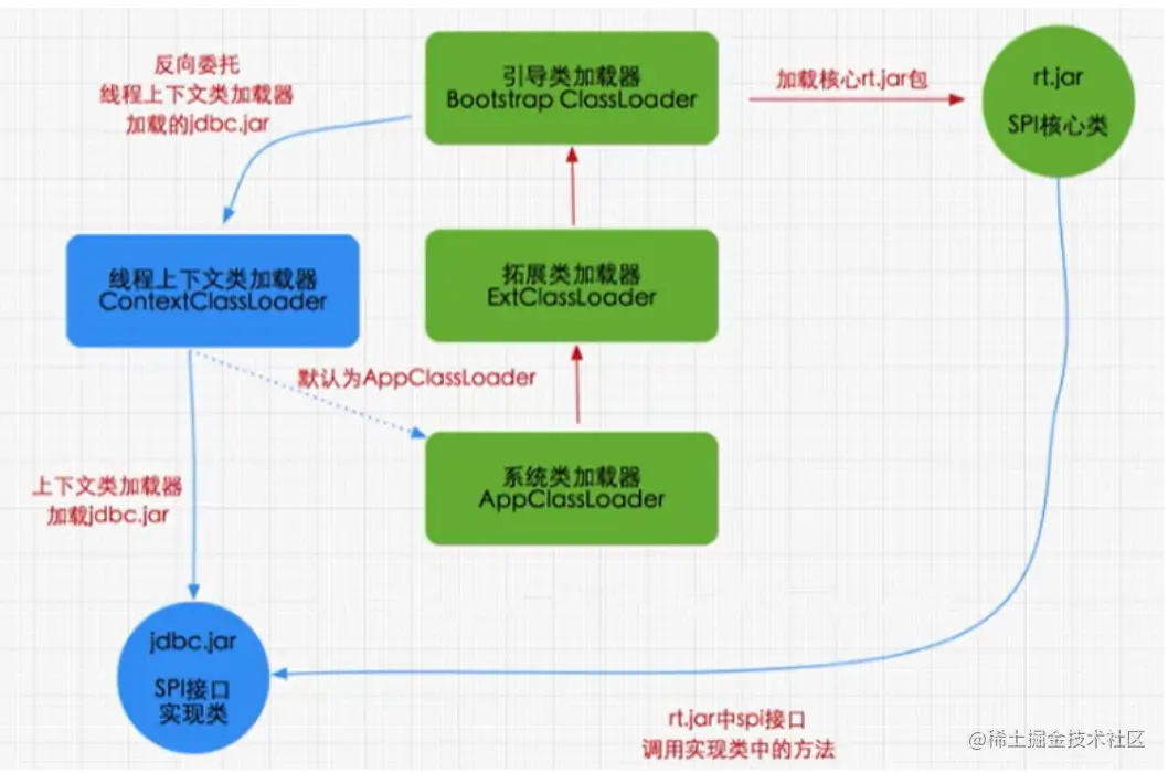 - 所以在加载的时候,会进行双亲委派,最终从根加载器中加载 SPI核心类,然后再加载SPI接口类