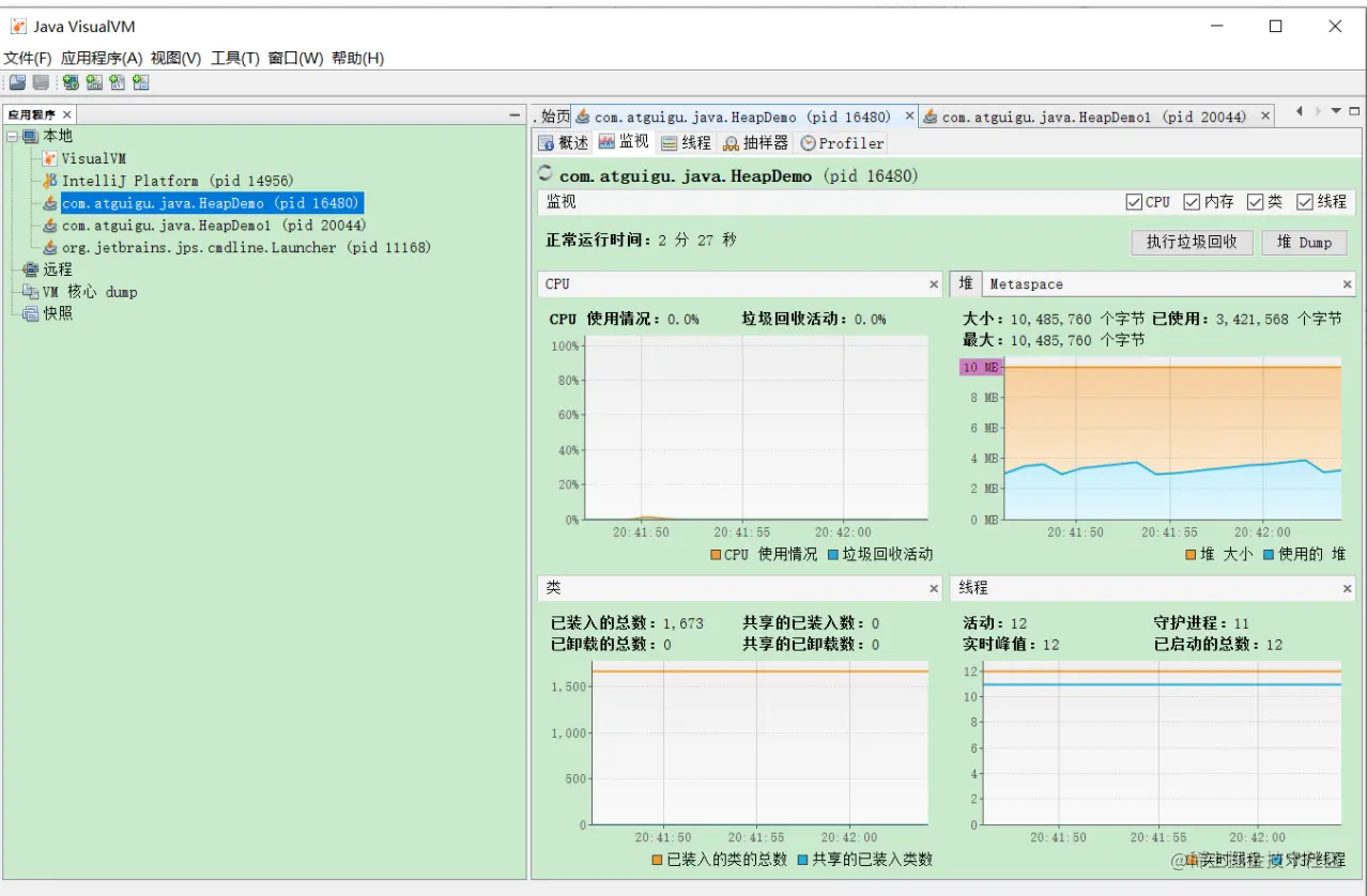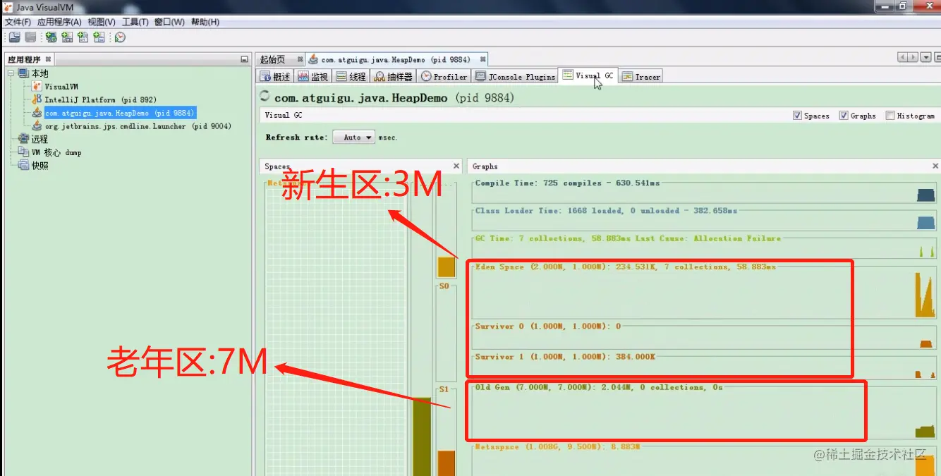 使用 **Java VisualVM ** 查看之前分配 10M 内存的程序
