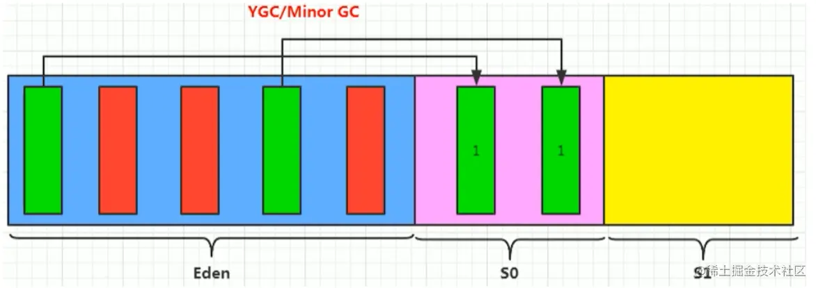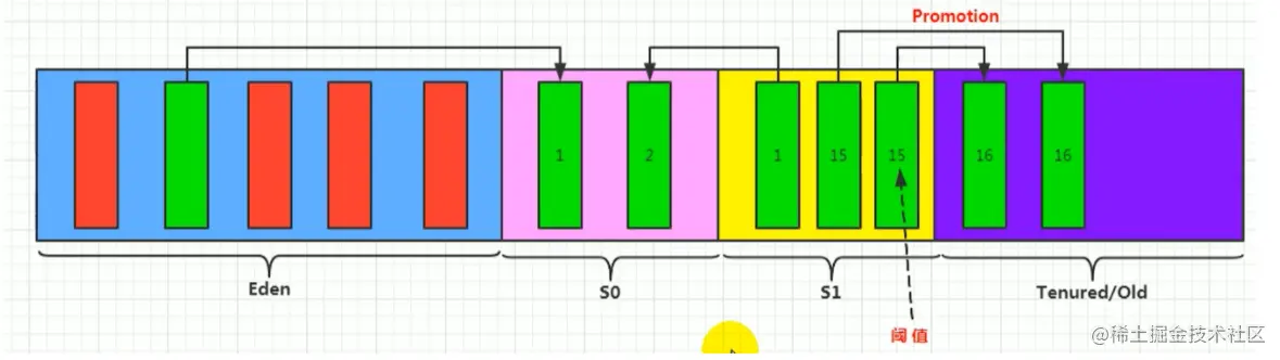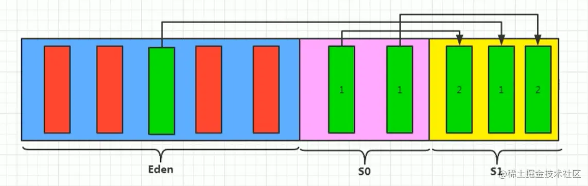- 年轻代是对象的诞生、成长、消亡的区域,一个对象在这里产生、应用,最后被垃圾回收器收集、结束生命。