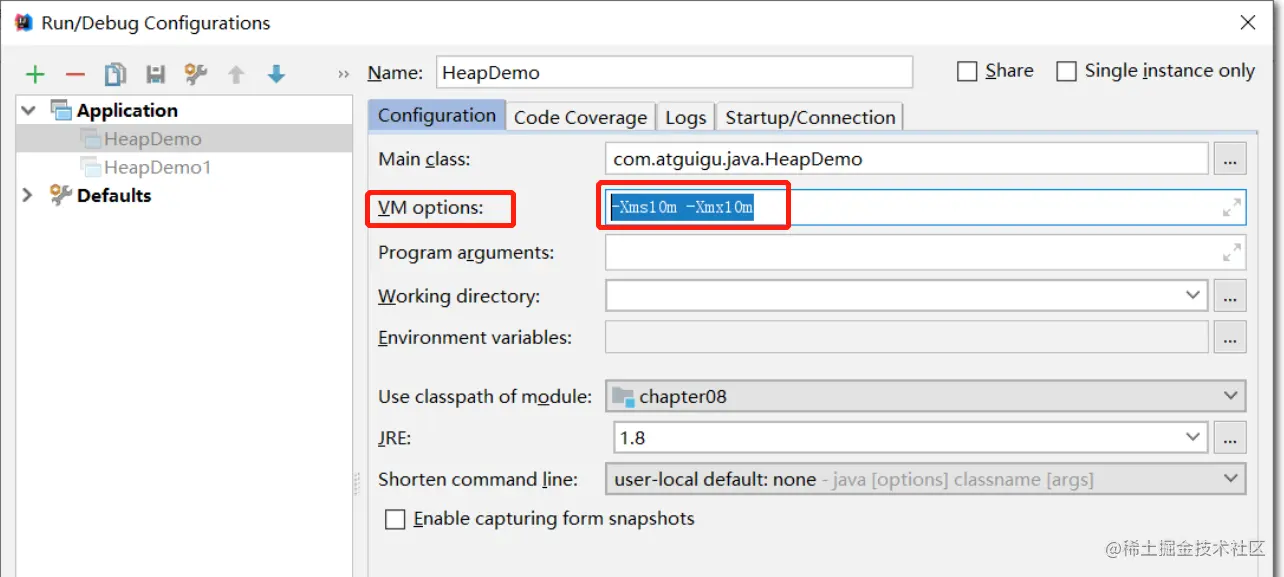 -Xms10m -Xmx10m // 初始堆大小 最大堆大小