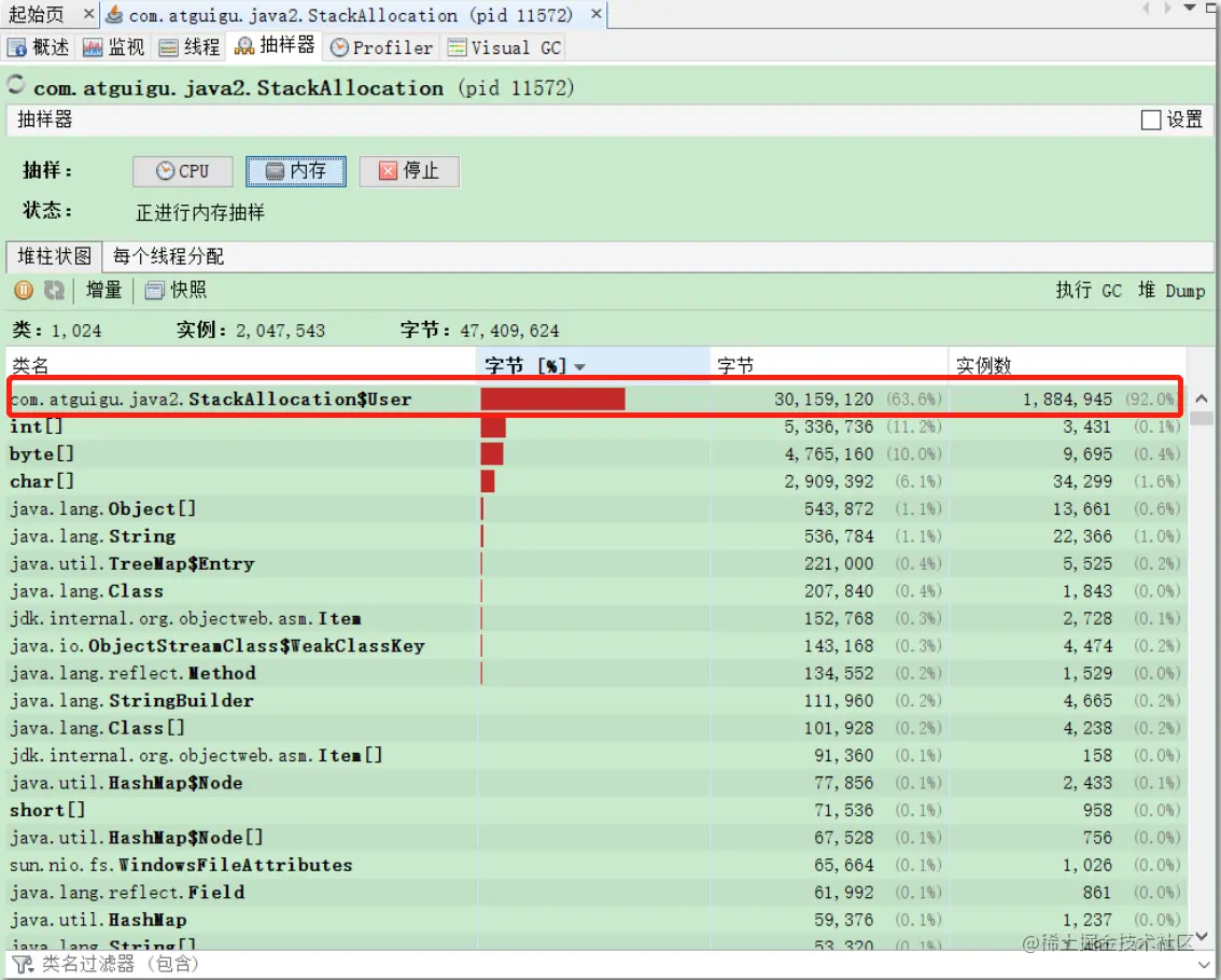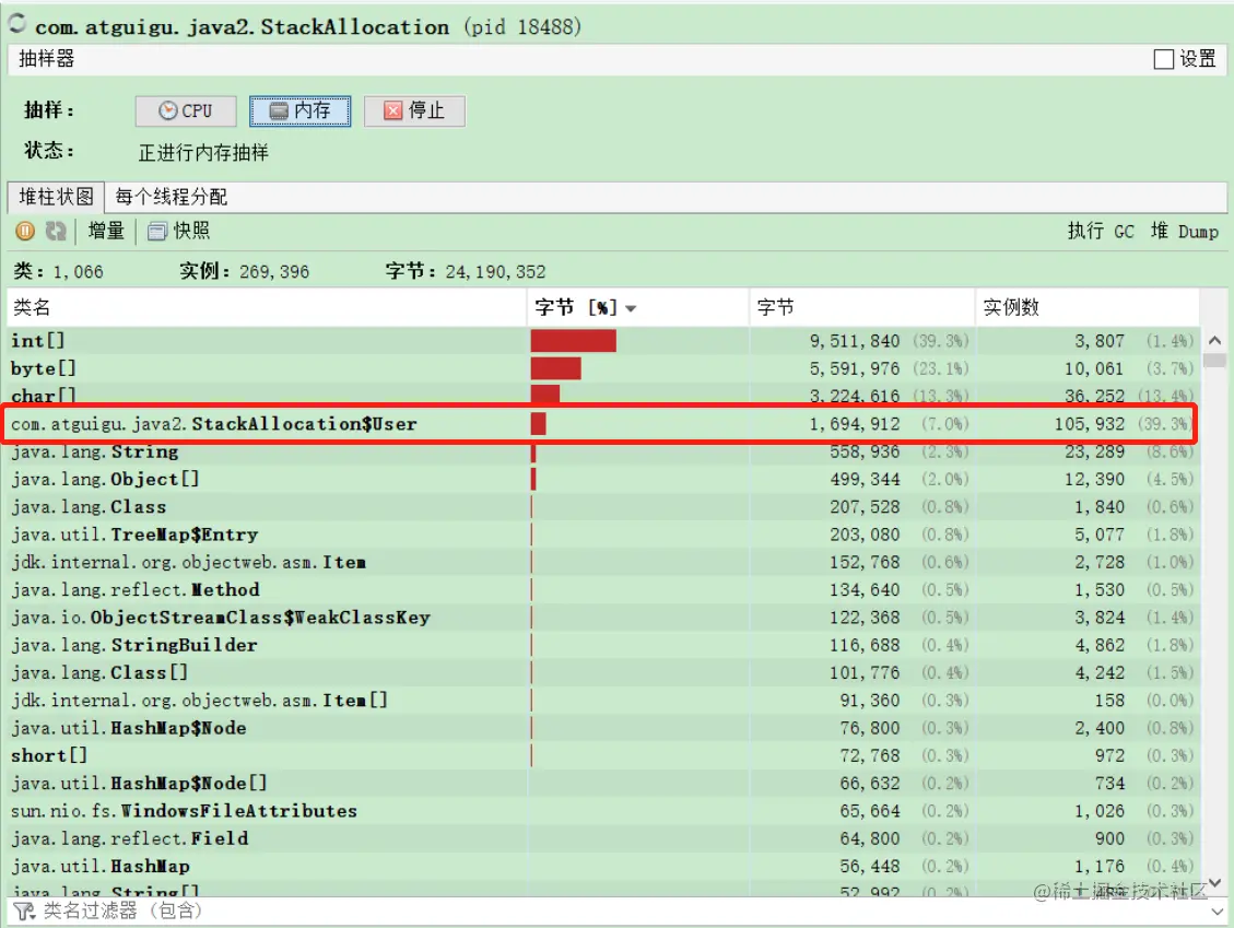 再看一下堆内存分配的情况,要比没开启少的多的多,都分配到栈上并随之销毁了(这里还有一点的原因,个人猜测是因为 JIT在 一开始并未对代码进行缓存 并进行逃逸分析)