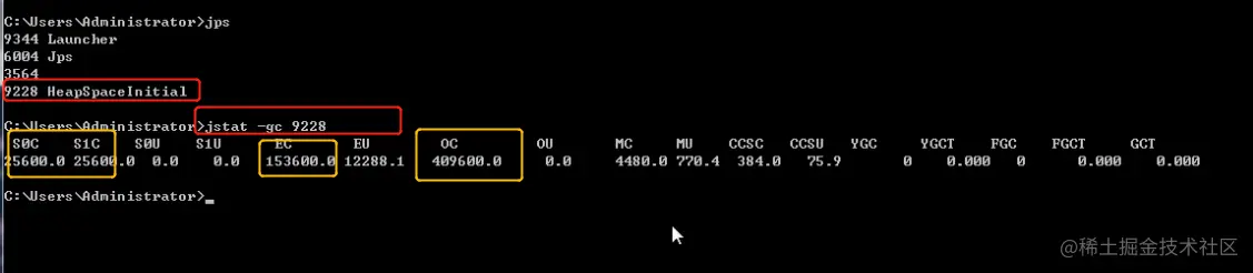 其中画黄色框子的区域分别为 两个Survivor 区的大小 , Eden 的区大小, OC 为 老年代的大小