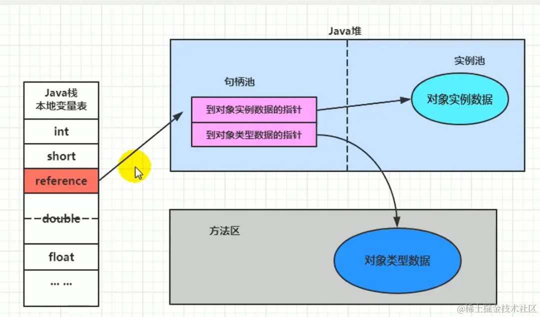 - 优点:reference中存储稳定句柄地址,对象被移动(垃圾收集时移动对象很普遍)时只会改变句柄中实例数据指针即可,reference本身不需要被修改