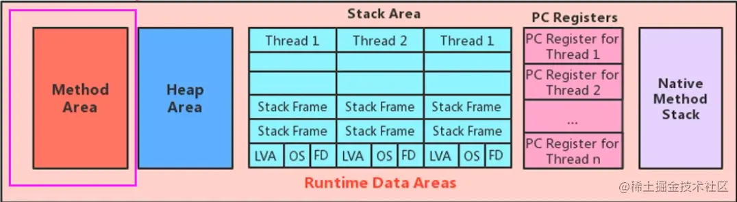 - 方法区(Method Area)与Java堆一样,是各个线程共享的内存区域