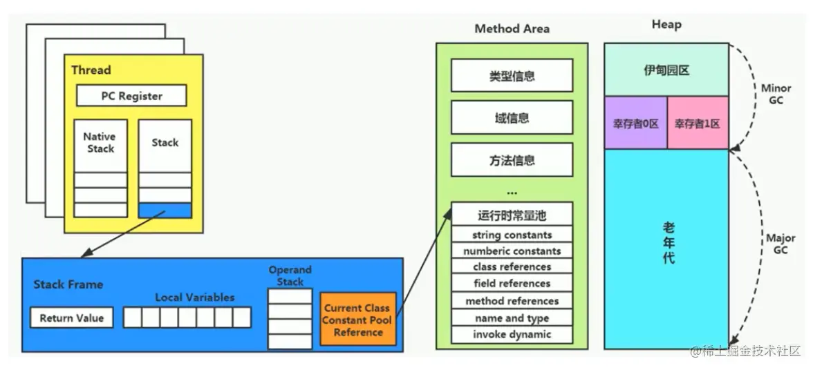 - 堆区 用于存放创建的对象实例, 划分两个区域 新生代和老年代,并有专门的垃圾回收器进行回收内存: Minor GC 针对于新生区,Major GC 针对于老年区,Full GC 针对于整个堆空间和方法区