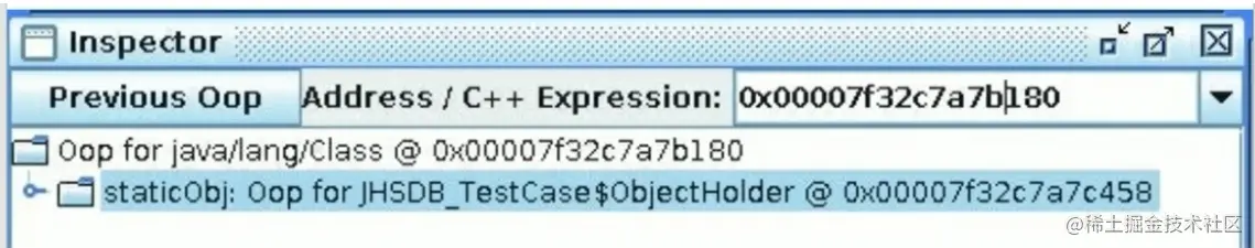 使用Inspector工具,找到了一个引用该staticObj对象的地方,是在一个java.lang.Class的实例里,并且给出了这个实例的地址,通过Inspector查看该对象实例,可以清楚看到这确实是一个java.lang.Class类型的对象实例,里面有一个名为staticobj的实例字段: