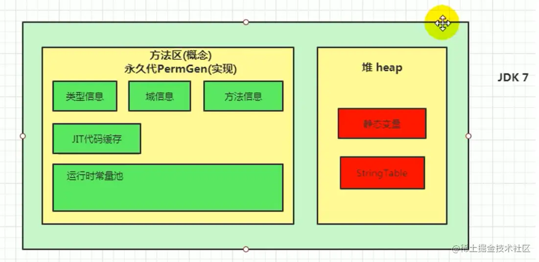 - 方法区主要用于保存类的元信息和运行时常量池,方法区在 JDK7 之前,使用永久代实现,在 JDK8 之后,使用元空间实现