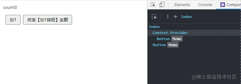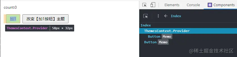 ThemesContext.Provider组件包裹 加1 按钮,并且将theme状态给ThemesContext.Provider的value数据 - 再创建一个 改变【加1按钮】主题 的按钮(点击后会改变