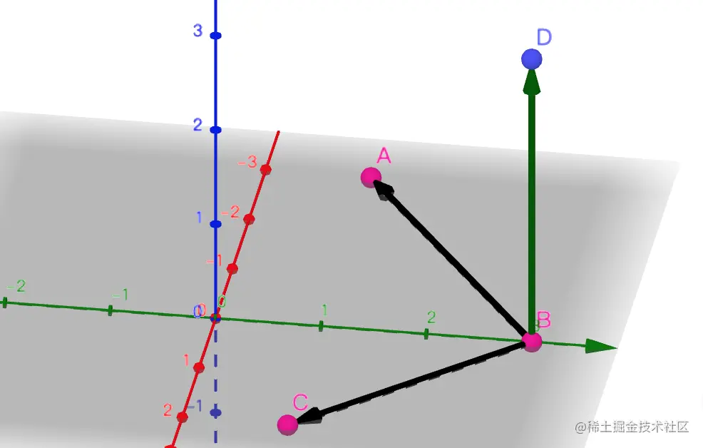 平面由 A、B、C 三个定义,构造向量 BA、BC,叉乘得到法线 BD,就可以用前面的公式来求其他点到平面的距离了。