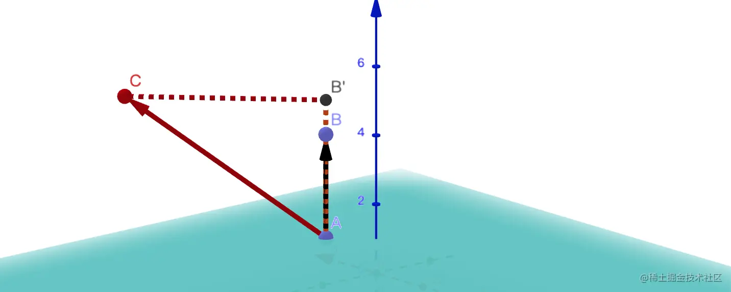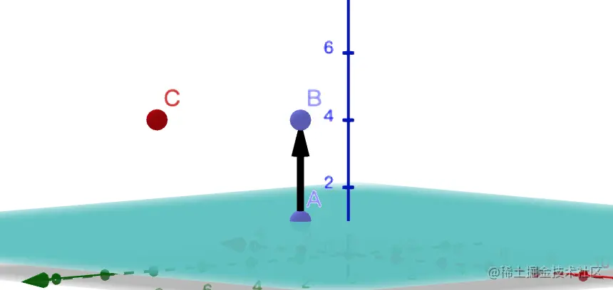 利用几何知识,我们知道从点 C 向平面做垂线,这个线段长度就是点 C 到平面的距离。那么这个垂线的方向是什么,长度又是多少?很显然,垂线的方向就是平面的法线 AB 的方向(或者说相反方向),那么长度就是 AC 向量在法线 AB 上的投影长。