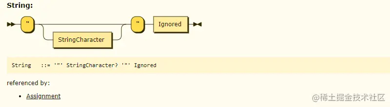 代表了 String 表达式由空字符串 "" Ignored (双引号里面是空的) 或不包含双引号的字符串 "StringCharacter" Ignored 构成. | 代表或, Ignored 代表可忽略的字符, 比如空格, tab, 换行, 注释等.