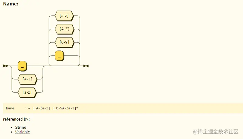 这代表了, Name 这个表达式开头由下划线 _ 或大小写字母 A-Za-z 构成, 熟悉正则表达式的同学立刻就会看懂. 然后后面由下划线, 大小写字母, 数字构成 _0-9A-Za-z, 最后的 * 代表这些可以有0或多个. (名称不能以数字为开头, 一部分原因其实是为了规避词法解析中与数字冲突的问题, 因为数字是用数字开头的, 如果不是数字的类型也用数字开头, 那么解析器的实现就会变得相当复杂)