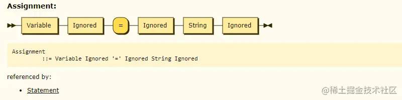 前面是 Variable, 然后跟着等号 =, 后面是 String. 中间有 Ignored 则代表, 可以用空格等将这些元素分开.