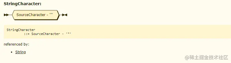 这里的 - '"' 代表不包含双引号 ", 即 StringCharacter 是 SourceCharacter 但不包含双引号. (String 要用双引号作为结束/闭合的标记)