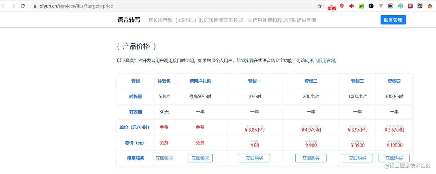 之后再到console.xfyun.cn/services/lf… 中申请5小时的免费体验包,可供转换5小时的语音时长,在30天内有效。若时长不够可以继续购买。价格如下图所示: