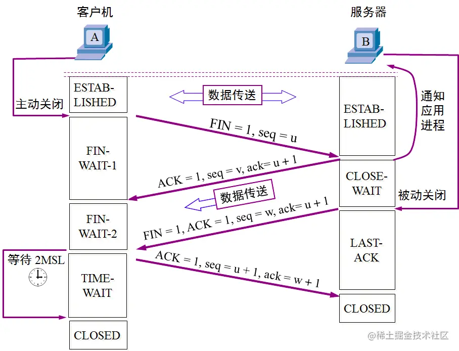 - 否则客户端在2MSL内没有再次收到来自服务器端的FIN报文,说明服务器端正常接收了ACK确认报文,客户端可以进入CLOSED阶段,完成“四次挥手”。