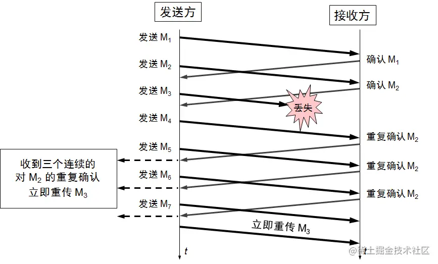 在TCP通信过程中,如果发送序列中间某个数据包丢失(比如1,2,3,4,5中的 3 丢失了)