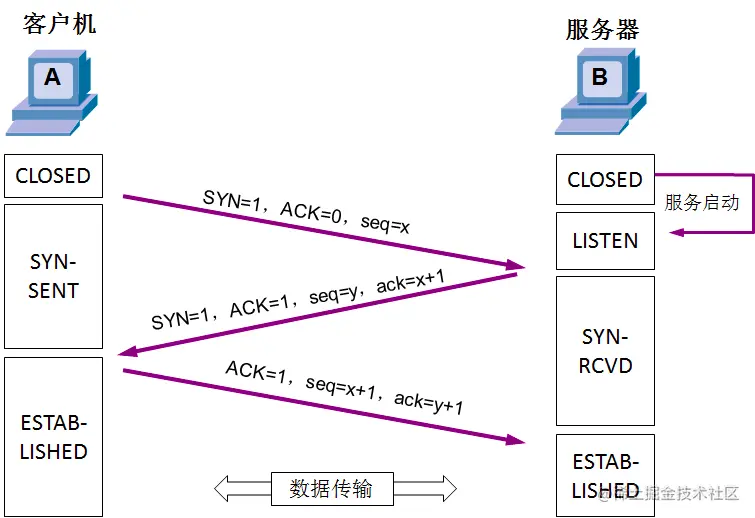 总结下来发送报文为 (SYN=1,ACK=1,seq=y,ack=x+1)