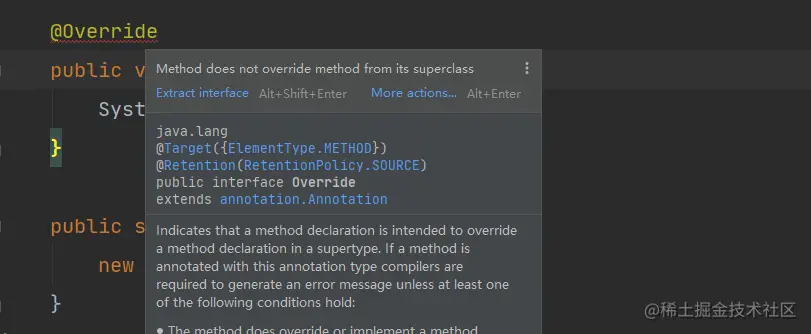 也就是说我们强烈建议,开发人员在重写父类方法时一定要加上@Override这个注解(现在idea这些开发工具可能都会自动加的),让编译器能够对这个方法进行校验,避免出现如下的问题: