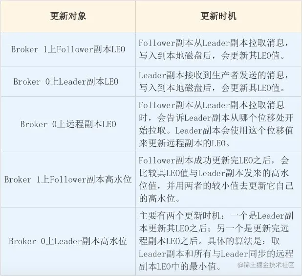 - Kafka副本机制在运行过程中,会更新Broker1上Follower副本的高水位和LEO值,同时也会更新Broker0上Leader副本的高水位和LEO,以及所有远程副本的LEO。但它不会更新远程副本的高水位值。
