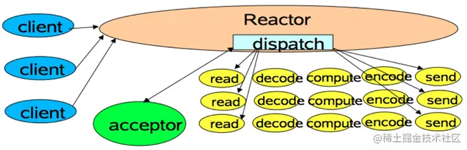 Reactor模式中,多个客户端发送请求到Reactor。Reactor有个请求分发线程Dispatcher,它会将不同的请求下发到多个工作线程中处理。