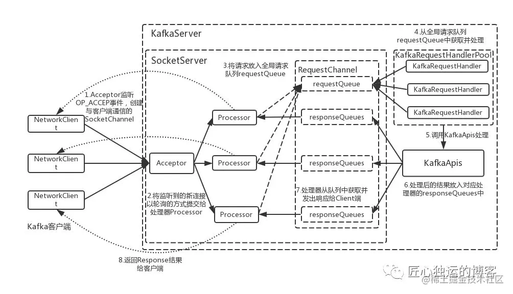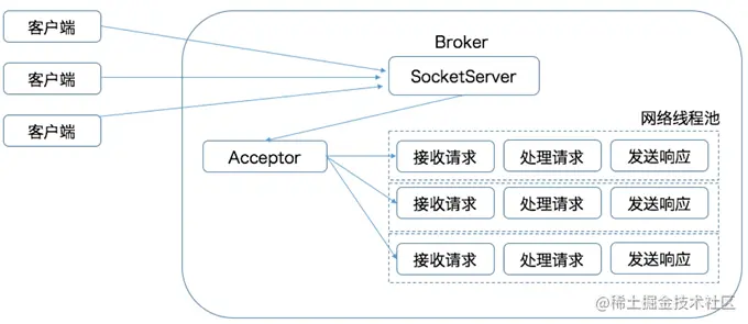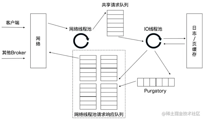 - Broker端还有个IO线程池,负责从该队列中取出请求,执行真正的处理。如果是PRODUCE生产请求,则将消息写入到底层的磁盘日志中;如果是FETCH请求,则从磁盘或页缓存中读取消息。