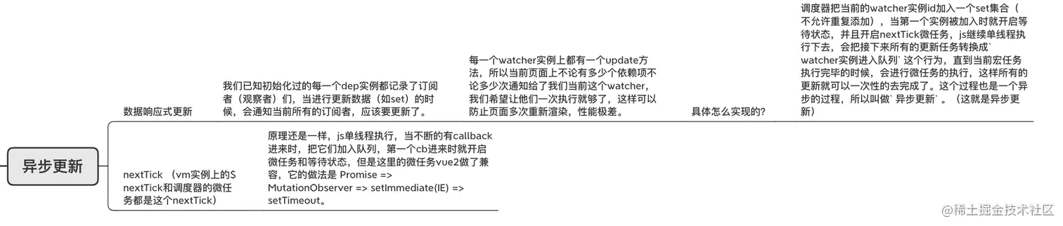 首先,前面的内容讲到的依赖收集,每一个vue.js的state都是一个依赖项,它们有自己相对应的watchers,当自身发生改变,就会通知订阅它的观察者们需要更新了。那么在你每一轮的对state的逻辑操作过后,就会有一个调度器(scheduler)把所有的观察者更新任务不重复的添加进一个异步更新队列,丢入一个nextTick微任务中,等到宏任务执行完成,这个微任务中的所有观察者更新任务就会一起执行。