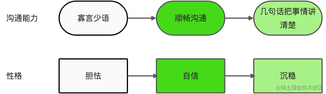 - 【自我评价变了】沟通能力上,也从顺畅沟通到几句话把事情讲清楚的程度,性格上更加沉稳一些。