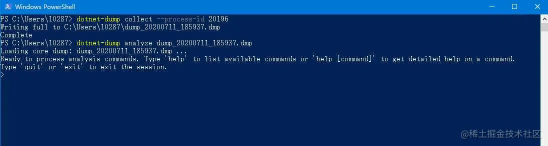 dotnet-dump是性能收集和分析实用工具,流程是先用 dotnet-dump collect 命令 收集当前程序的运行时信息,然后通过 dotnet-dump analyze 命令启动交互式 shell命令,来分析程序。