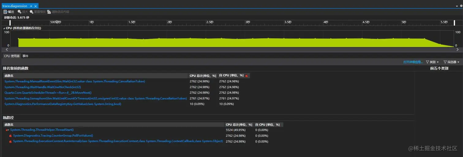 运行后,数据收集到 trace.nettrace 文件, 按 键停止收集, 可以用 PerfView 打开,我是直接用 VS 打开的,可以看到收集到的数据还是比较全面的。