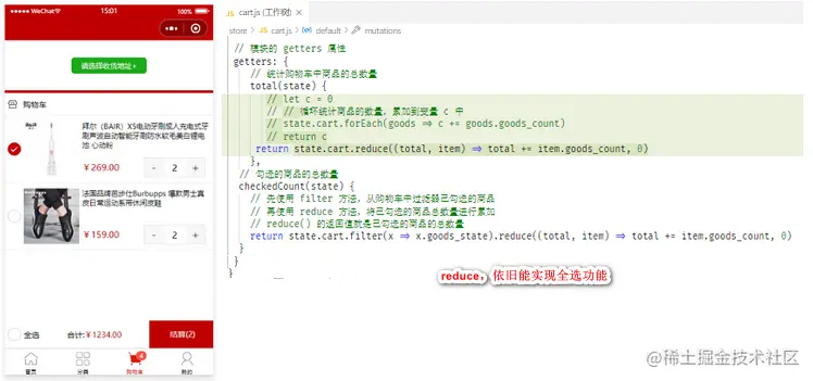 使用数组的reduce方法改造total的计算方式