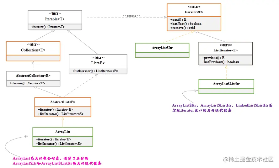 在JDK涉及到的迭代器Iterator都与集合有关,主要相关实现在java.util包下。下面以 ArrayList 为例进行分析: