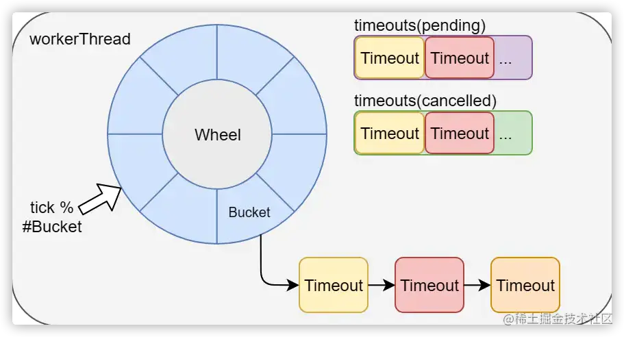 这两个队列分别记录新添加的定时任务和要取消的定时任务,当workerThread每次循环运行时,它会先将pending-timeouts队列中一定数量的任务移动到它们对应的bucket,并取消掉cancelled-timeouts中所有的任务。由于添加和取消任务可以由任意线程发起,而相应的处理只会在workerThread里,所以为了进一步提高性能,这两个队列都是用了JCTools里面的MPSC(multiple-producer-single-consumer)队列。