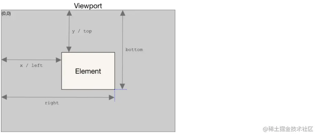 Element.getBoundingClientRect() 返回一个DOMRect对象,包含元素大小及相对视口的距离,其中大小包括padding和border,如果是标准盒子则为width or height property of the element + padding + border-width,如果是