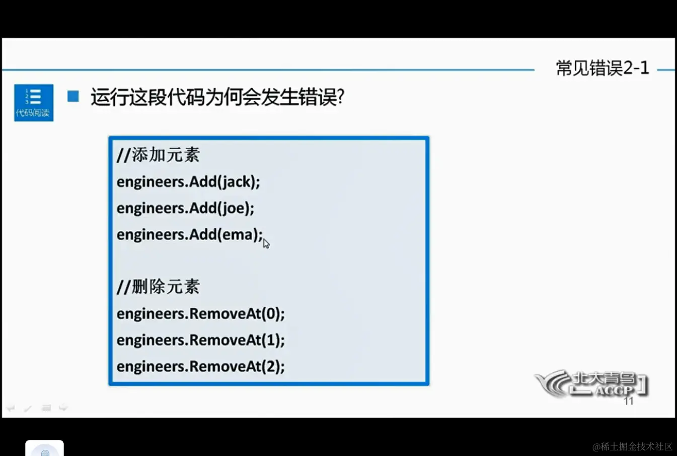 动态数组的其它方法 ArrayList ifubing 2021-01-03 70 阅读1分钟 遍历 删除 Remove(数据) RemoveAt(索引) Clear() 删除数据不存在时,会出错 删除索引不存在时,会报错,数组越界 常见错误