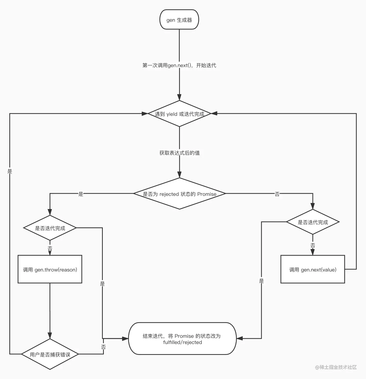 // 外层包装 Promise 的 reject 函数,使用迭代器的 throw 方法同步抛出异常后如果没有捕获我们需要手动 reject 改变 Promise 状态