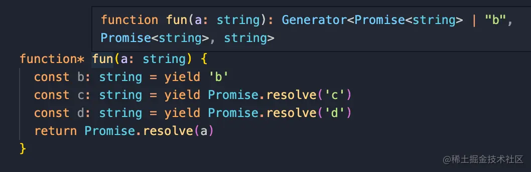 一个返回值为 Promise 的函数: 正如我们最开始的需求,对传入 Generator 函数的类型获取,就是为了对包装后的函数做正确的类型推断。该函数的形参类型是与 Generator 函数一致的,同时返回值类型是对 Generator 函数的返回值类型做了 Promise 的解包处理后的结果,并在外面包裹了一层 Promise,就如同 async/await 函数。