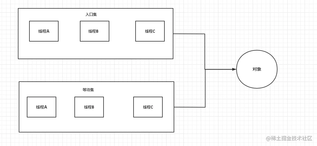 那这就跟锁的位置有关系了,我们知道锁是放在对象中的,JVM(一般不加说明说的虚拟机都是HotSpot,Oracle发行的虚拟机)会为每个对象维护一个入口集(Entry Set)用于存储申请该对象内部锁的线程。除此之外,JVM还会为每一个对象维护一个等待集(Wait Set)的队列,该队列用于存储该对象上的等待线程。