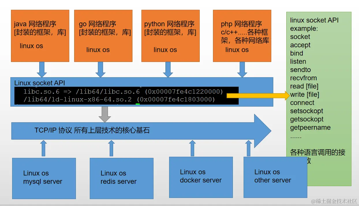 没有它们各种高大上牛逼的技术就无从建立起来。而这根基对大家所用的java,go,py,php,c,c++,nodejs...都是一样的,只不过是基于Linux api做了各种各样的封装百家争鸣,百花齐放,跟易经里的阴阳构成64卦一样,当你刚开始撸程序时,可能并不会觉得基础的重要性,甚至可能几年内一直是框架crud boy,你并不会察觉到基础核心Linux socket api!