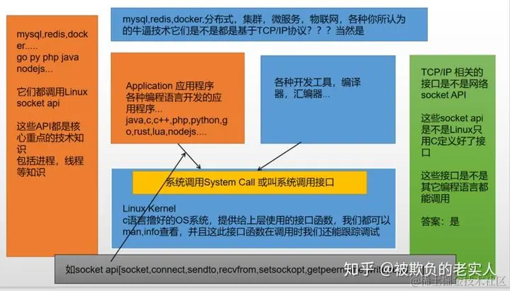 linux socket api 是所有语言,数据库等应用的核心低层技术知识,你框架掌握的再6,没有多少意义,语言掌握得再6也只是工具,你要掌握的是数据来回传输靠的TCP/IP协议,而这些协议的相关API 就是LINUX SOCKET API,做为一名码农我觉得你有必要学这套!!!没有这套SOCKET API 或是你没有掌握,那只能受制于人!天天为表面的语法,框架,语言争吵。