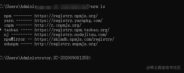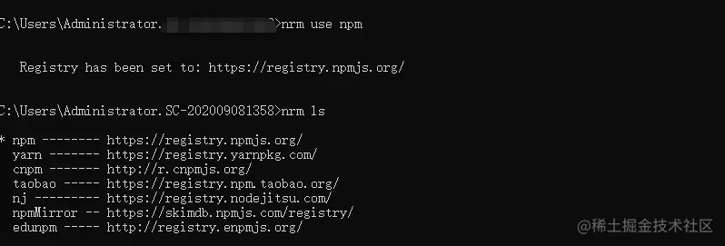 成功解决问题,通过nrm ls命令查看下载和当前使用情况: